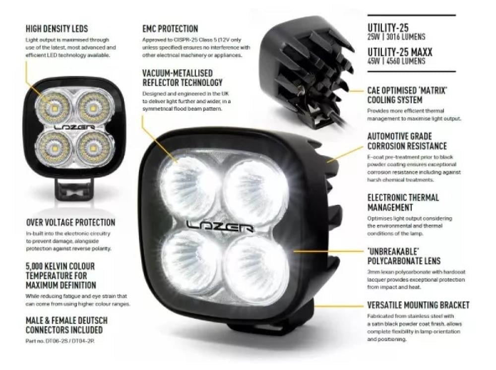 The Utility-25 MAXX from Lazer lamps is a powerful and versatile medium duty LED work light which utilises the very latest in 'bin' LED technology to provide superior light output for such a compact unit. Ideal for service vehicles, vans, trucks or off road vehicles the Utility-25 MAXX is able to operate at voltages between 9-32V and features an incredibly durable alloy casing which is both anodised and powder coated for the ultimate in corrosion and chemical resistance.